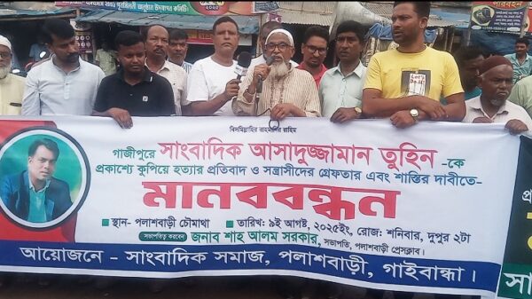 সাংবাদিক তুহিন হত্যার প্রতিবাদে পলাশবাড়ীতে সাংবাদিক সমাজের মানববন্ধন